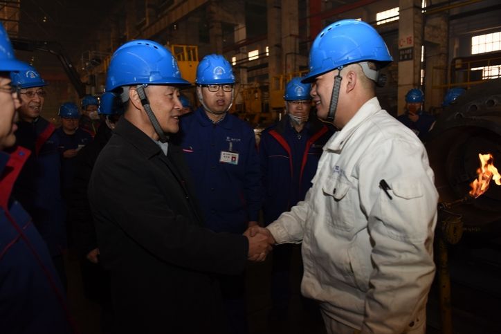斯?jié)煞蛟阱仩t公司輕容分廠走訪慰問,與中央企業(yè)勞模昝濱親切交談