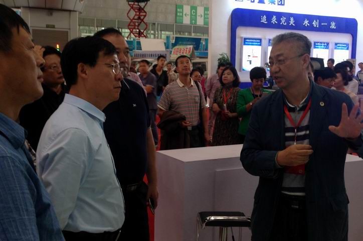 圖為哈電集團副總經理苗立杰(右一)向出席展會的領導介紹哈電集團產品