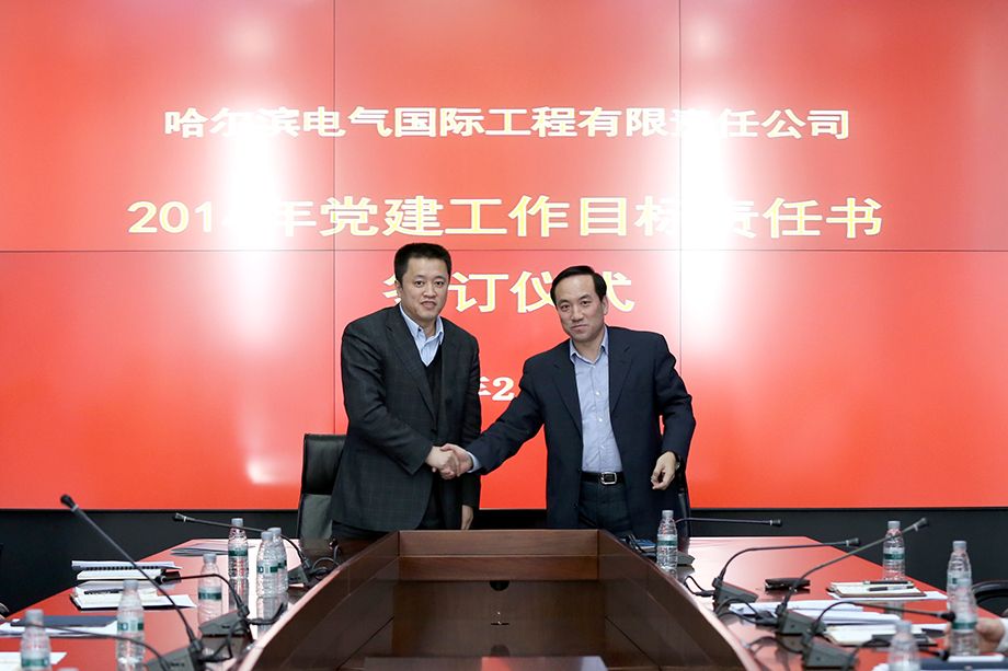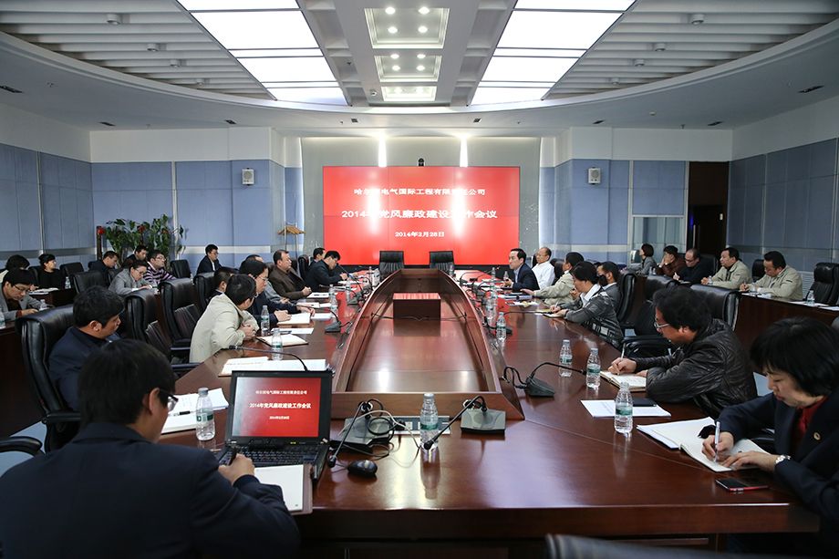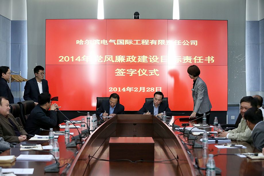 2014年2月28日,哈電國(guó)際召開2014年度黨風(fēng)廉政建設(shè)工作會(huì)議。哈電國(guó)際董事長(zhǎng)、總經(jīng)理、黨委副書記郭宇,黨委副書記、紀(jì)委書記張立偉,副總經(jīng)理董銀柱、楊慶利,總會(huì)計(jì)師王惠榮出席會(huì)議。張立偉主持會(huì)議并傳達(dá)學(xué)習(xí)了集團(tuán)公司黨委書記、董事長(zhǎng)宮晶堃在哈電集團(tuán)2014年度反腐倡廉工作會(huì)議上的講話精神和黨委常委、紀(jì)委書記白紹桐的工作報(bào)告,同時(shí)代表公司黨委與各部門代表簽訂了《2014年黨風(fēng)廉政建設(shè)責(zé)任書》和《2014年黨建工作目標(biāo)責(zé)任書》。